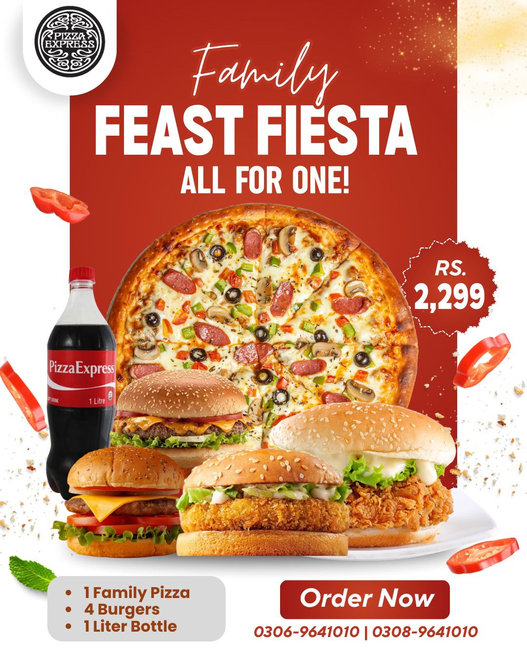 Get 1 Family Pizza, 4 Burgers, 1 Litter Bottle!!